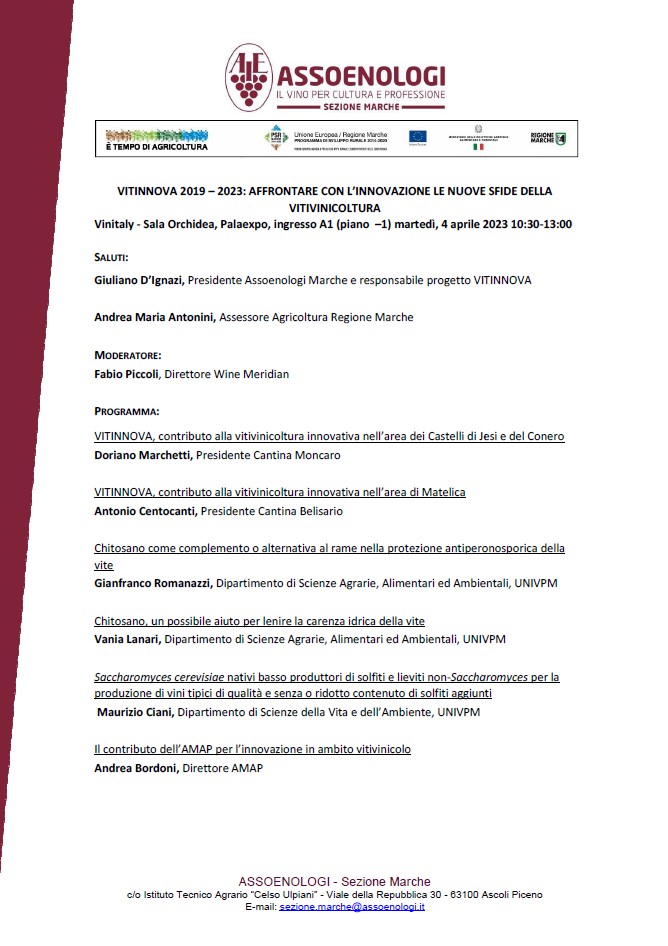 ll Servizio Fitosanitario Regionale, partner del progetto Vitinnova (PSR 2014-2020 Mis.16.1.2), invita alla diretta facebook del convegno VITINNOVA 2019 – 2023: AFFRONTARE CON L’INNOVAZIONE LE NUOVE SFIDE DELLA VITIVINICOLTURA c/o Vinitaly – Martedi 4 aprile 2023: 10:30-13:00.